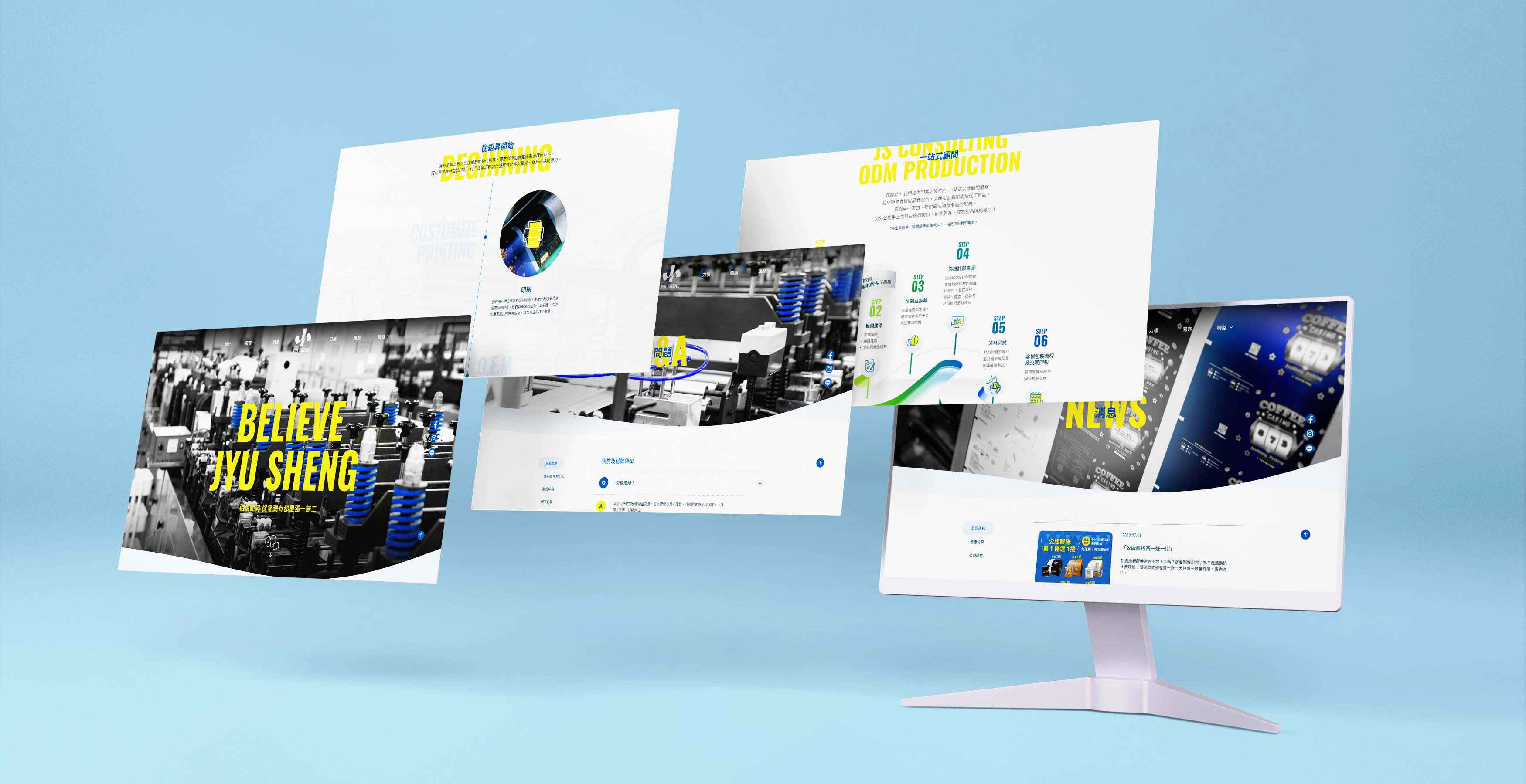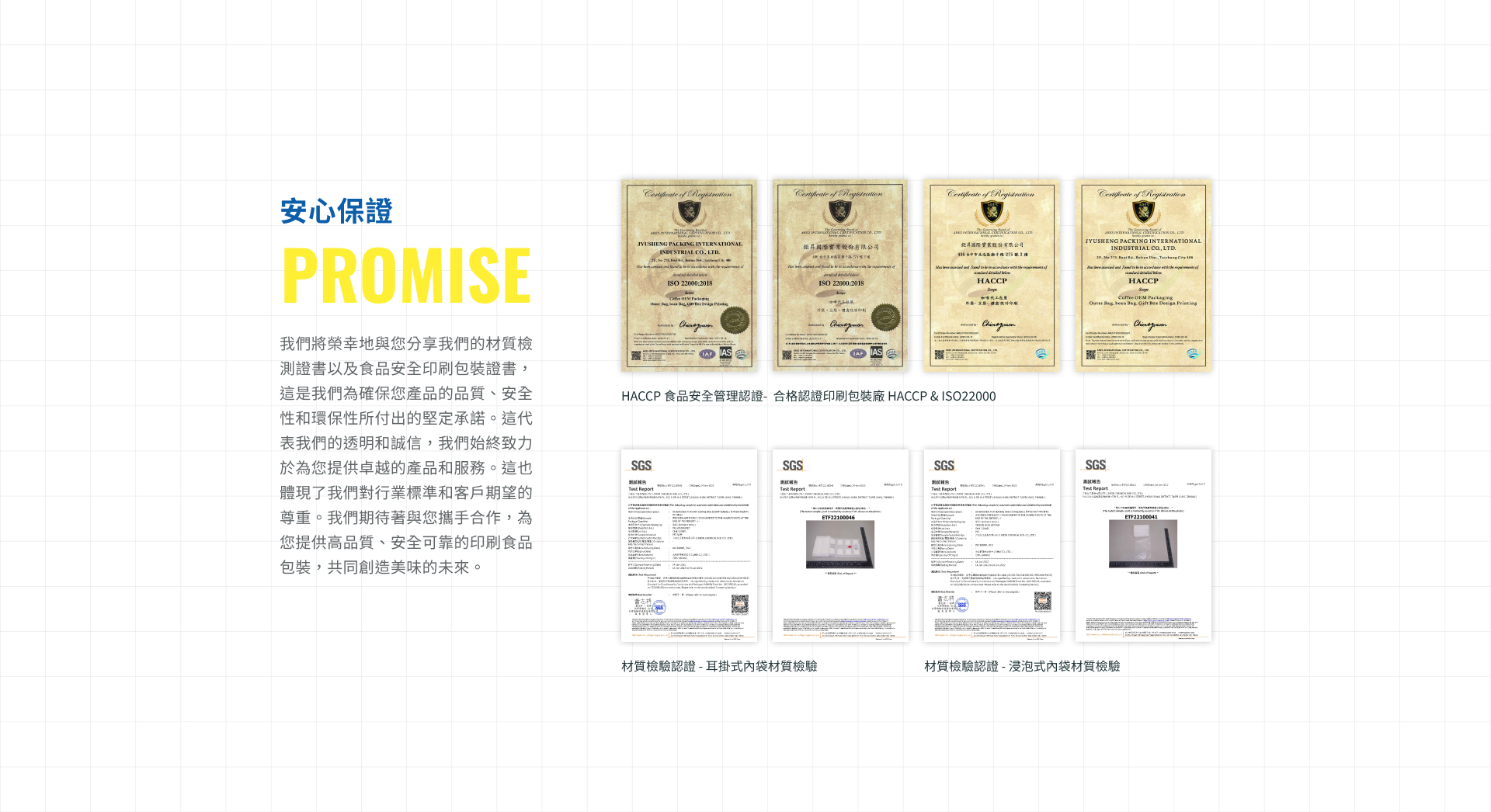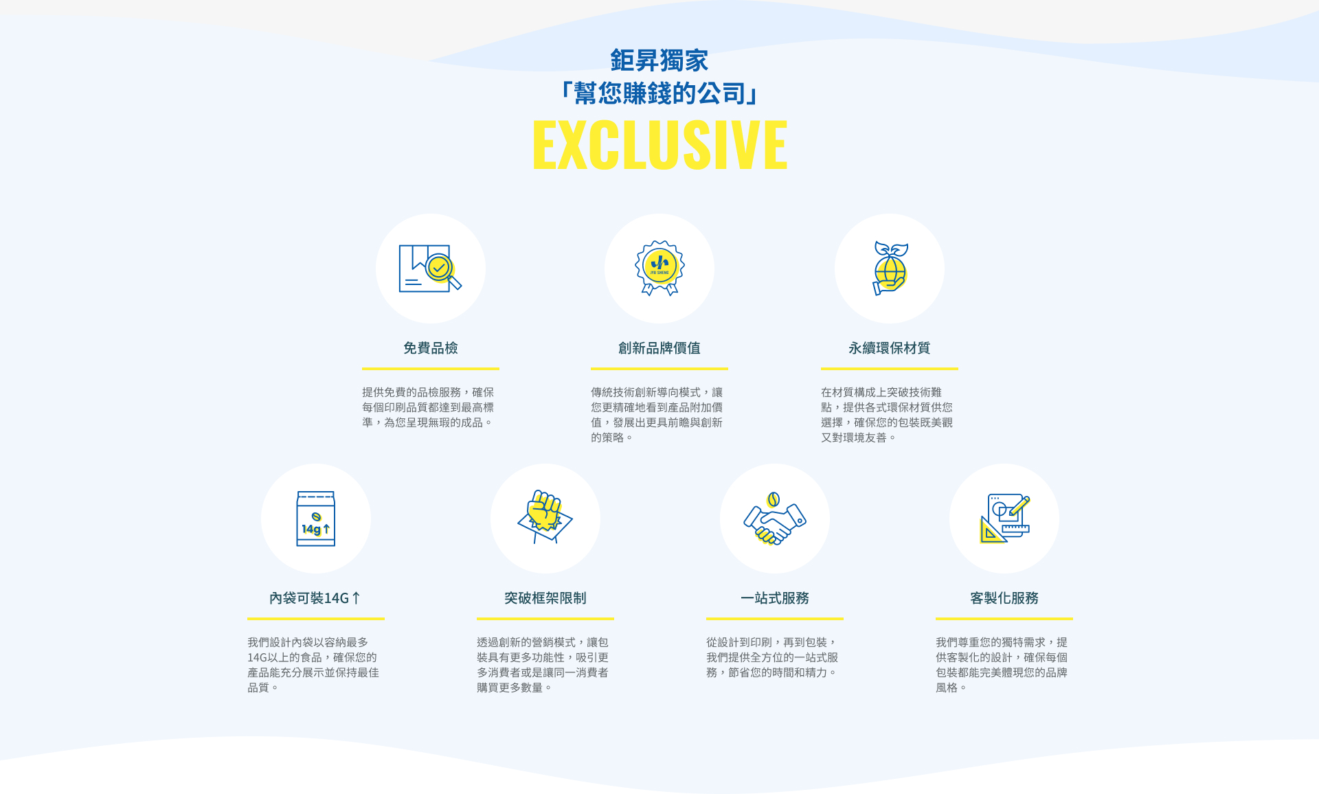鉅昇國際擁有多項業界領先技術及客製化服務, 專業SOP結合產線製造降低成本, 打造專業咖啡包裝印刷、代工及多項客製化服務滿足客戶需求, 提升市場競爭力。 為滿足客戶印刷需求, 鉅昇國際斥資添購多台新型印刷設備, 針對少量客製化印刷需求及全品項尺寸規格豆袋皆能製作 「滿版全彩」印刷,讓客戶不再侷限於豆袋的印刷限制。